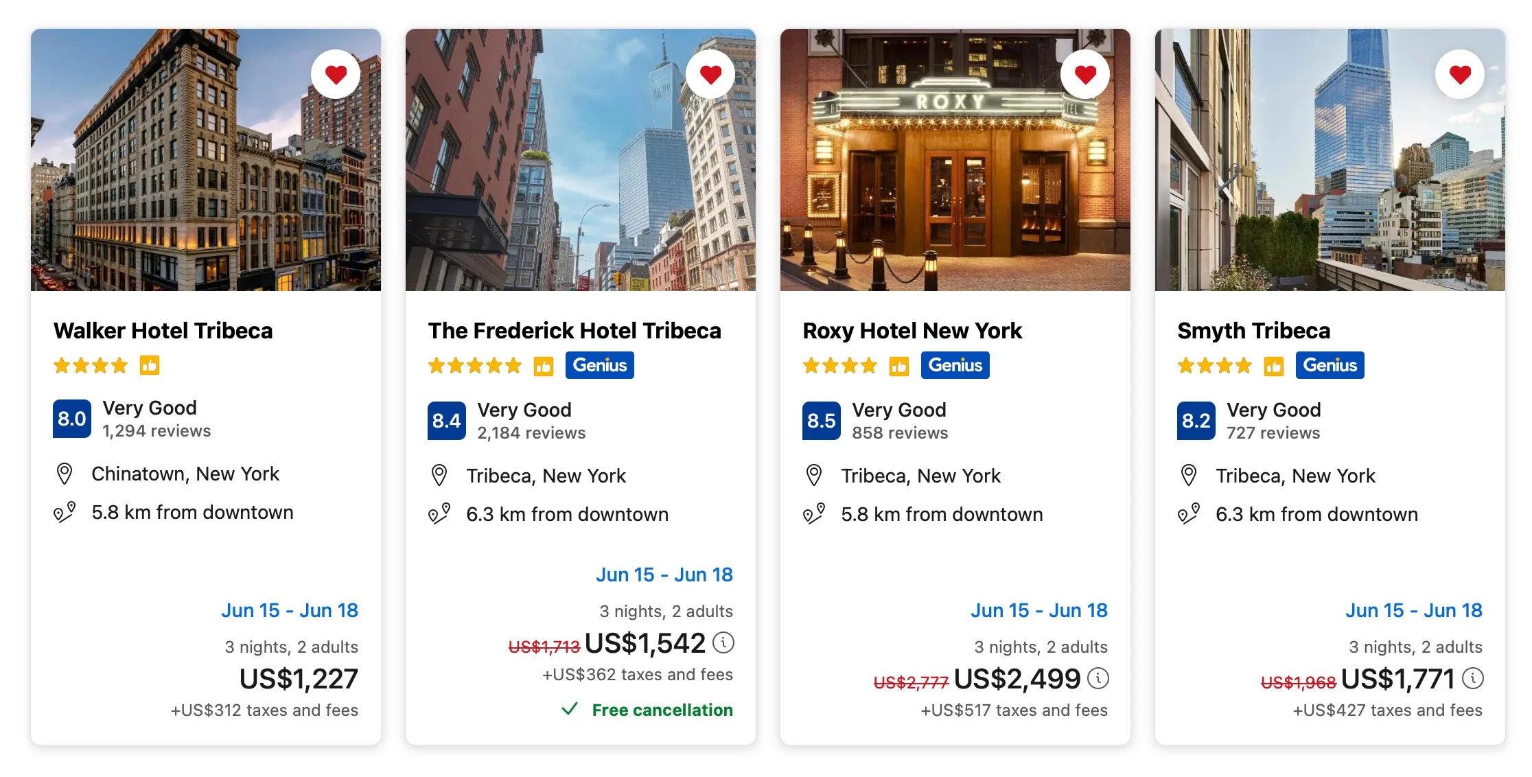 Image below: Four Tribeca hotels appearing within the same Booking.com search results.