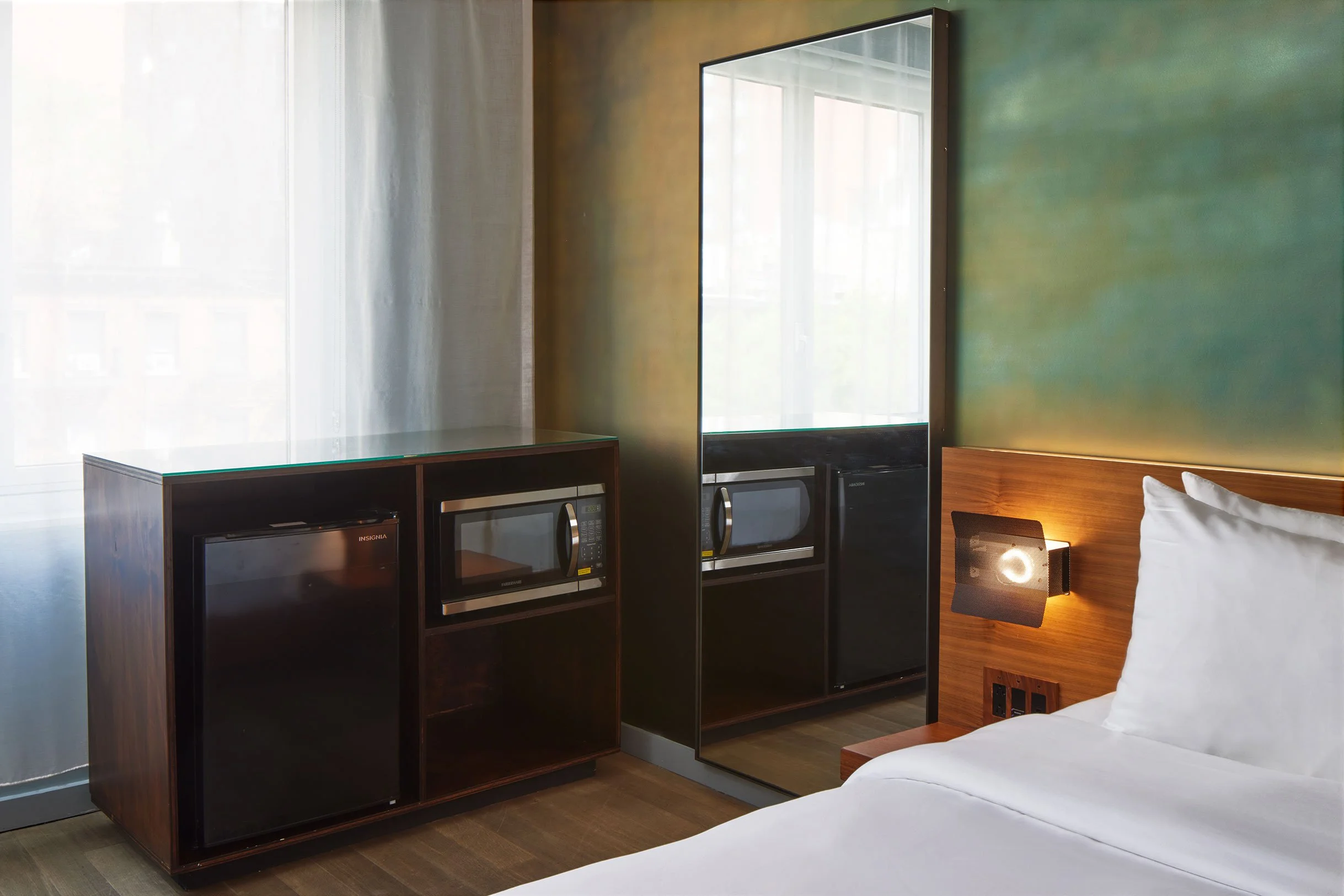Photography emphasized practical in-room features that influence booking decisions for city travelers: